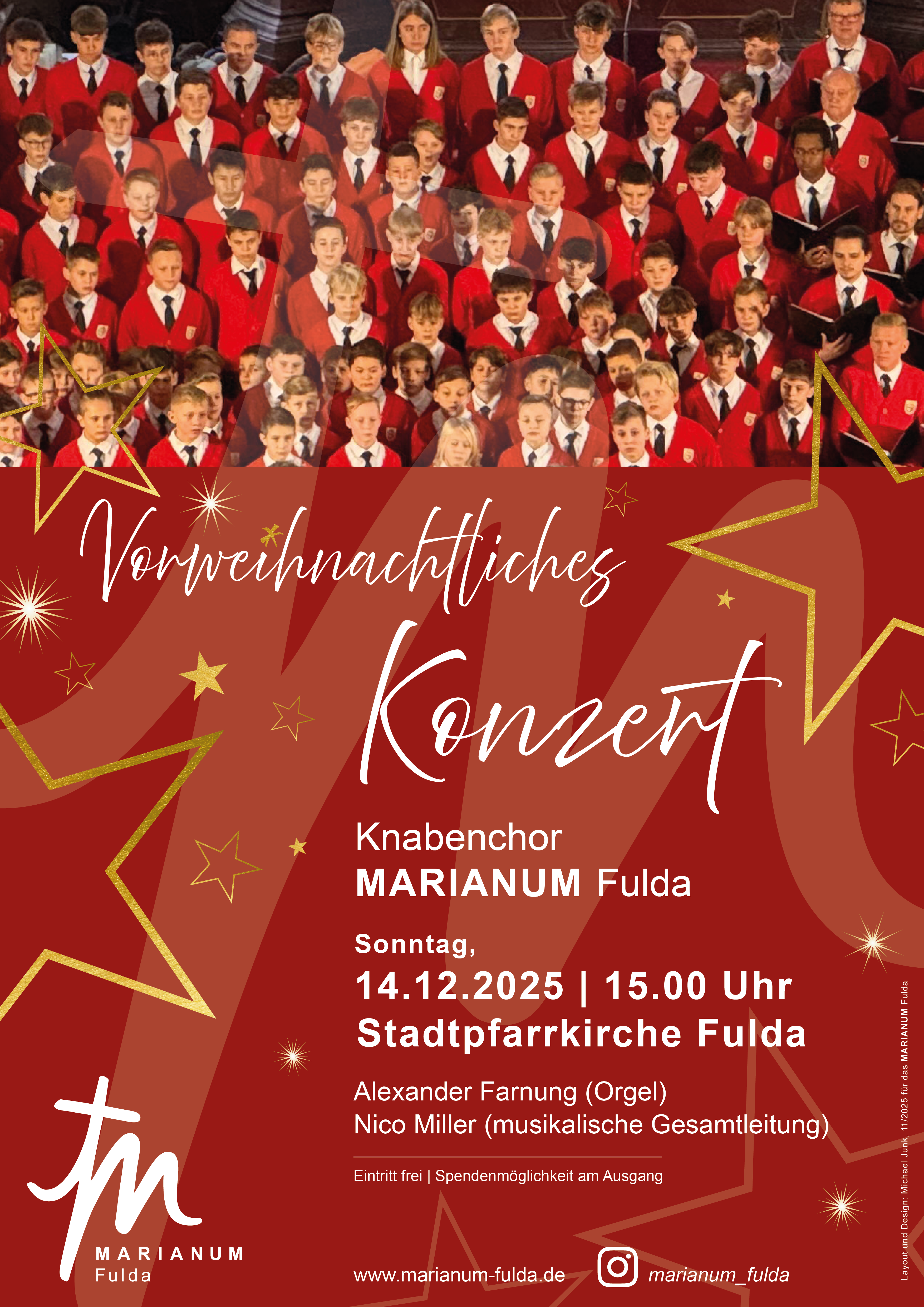 Der Knabenchor des M A R I A N U M Fulda, der im kommenden Jahr sein 60-jähriges Bestehen begeht, lädt am Sonntag, den 14.12.2025 um 15.00 Uhr zu seinem traditionellen vorweihnachtlichen Konzert in die Stadtpfarrkirche Fulda ein. Unter der neuen musikalischen Leitung von Nico Miller präsentieren die rund 120 jungen Sänger gemeinsam mit den Männerstimmen berührende Chorwerke von Klassik bis Moderne. An der Orgel spielt Alexander Farnung.