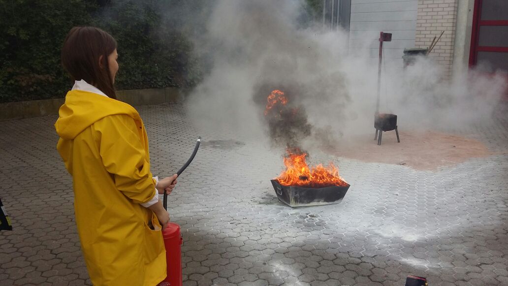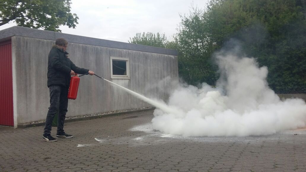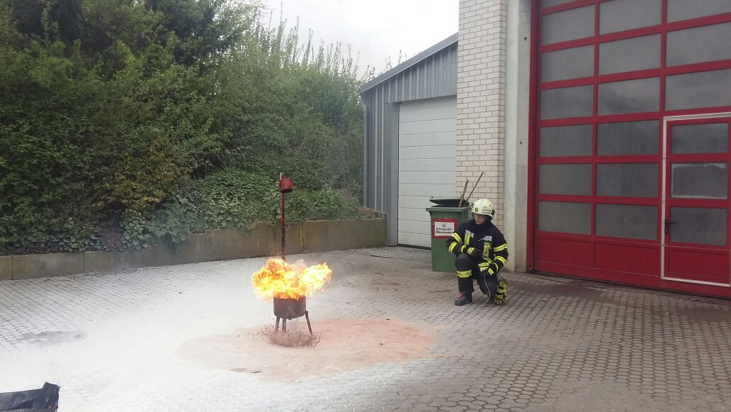 Zum Abschluss durften die Jugendlichen ein kleines Feuerwehr mit unterschiedlichen Feuerlöschern bekämpfen. Ein Highlight des Tages war noch eine Fettexplosion, die durch Justin Richter vorgeführt wurde. Demonstiert wurde hierbei, dass man brennendes Fett niemals mit Wasser löschen sollte.