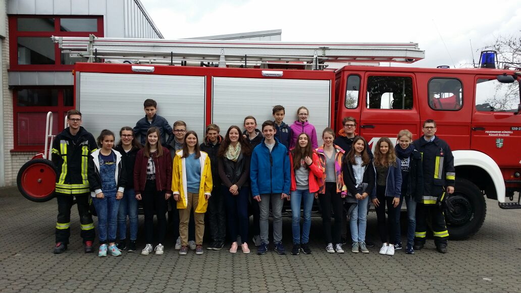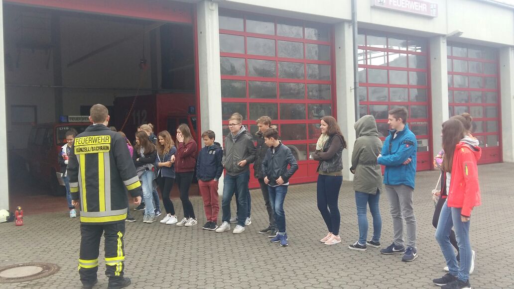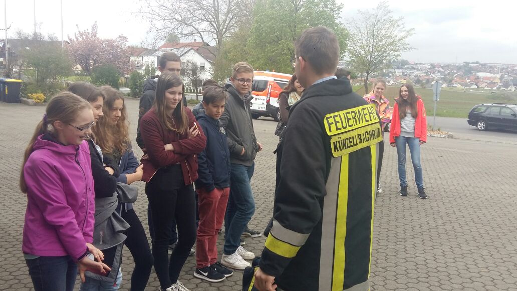 Gemeinsam fuhren die Schulsanitäter am letzten Freitag zur Freiwilligen Feuerwehr Künzell-Bachrain. Dort wurden sie von den Feuerwehrleuten Justin Richter und Tobias Fraatz in Empfang genommen.